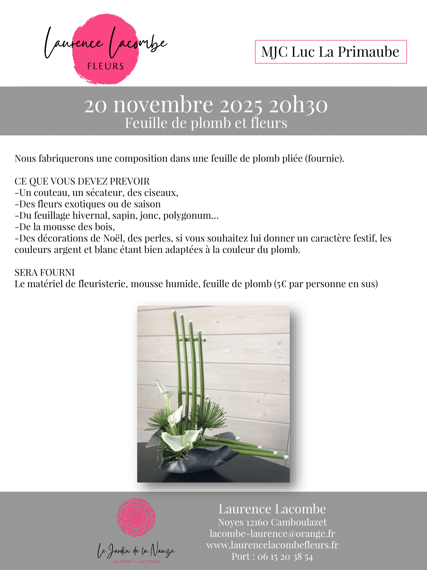 Mettez votre esprit créatif au service de l’art floral pour des compositions originales et uniques ! Ce cours tous niveaux vous accueille pour un moment de créativité autour du végétal. Chaque atelier propose une thématique différente pour travailler sur des modèles variés, avec des végétaux différents selon les saisons. Comment se déroule un atelier floral à la MJC ? Chaque participant-e amène ses fleurs. Le feuillage est partagé pour s’enrichir mutuellement et réaliser des bouquets plus intéressants visuellement. Moment de partage et de convivialité, l’atelier floral a lieu une fois par mois. Art à part entière, la création florale vous permettra d’harmoniser les couleurs et les matières, de créer des volumes et de belles lignes florales. Vous serez accompagnée par une animatrice passionnée, Laurence, pour progresser à chaque atelier.
